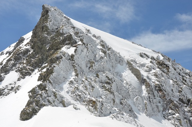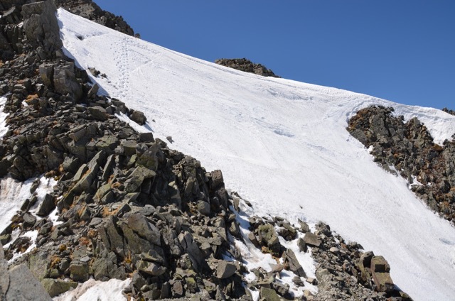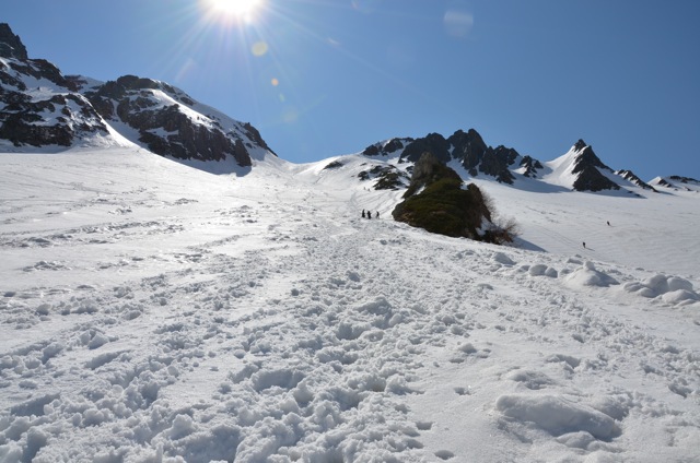 写真の部分は無雪期でも緊張感が走る場所なのですが、積雪期は角度のある雪渓になり、さらに一層登頂を困難にさせます。もちろん凍結している場合、反対に雪が腐ってアイゼン・ピッケルが効果ない時などがあります。万が一滑落した場合は谷底まで行ってしまいますので命の保証はありません。