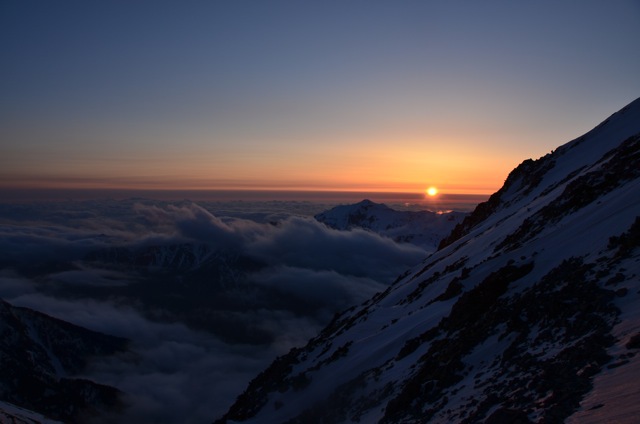 やはり初めて奥穂高岳にアタックした時の写真ですが、初日に穂高岳山荘まで上がり、夕食を終えて外に出てみると雲ひとつない快晴の空で夕日が沈もうとしていました。3000mの山岳では午後になると上昇気流により雲が発生することが多く、なかなか日の入りの時間に快晴であることが少ないです。その中にあって、しかも春の時期にここまで美しい夕日を観れたのは後にも先にもこの時だけです。