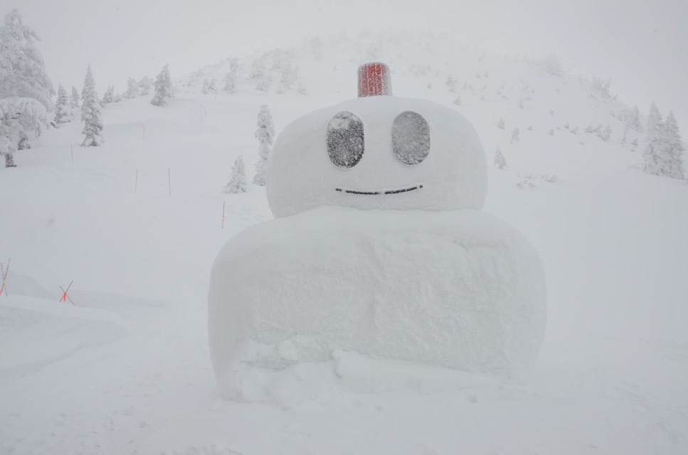 山荘前には恒例の巨大な雪だるまが設置されています。今日は天候が悪く登山者もいないのでなんだか寂しそうです。