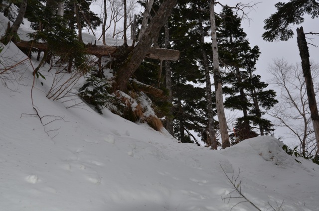 トレースがあるとはいえ一人分のトレースだけなので、ラッセルの先頭よりはマシというレベルであった。やはり登り部分はきつく感じる。それでもまだ山荘までトレースがあると信じていたので、倍くらい時間はかかるだろうが山荘にはたどり着けると思っていた。まだ写真を撮る余裕があった。