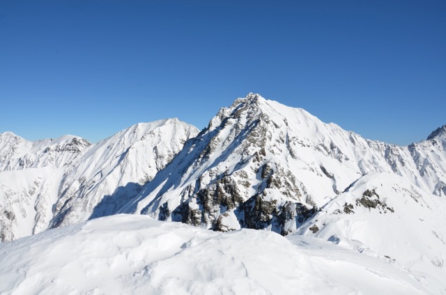 今日は天候に恵まれ予定した独標を超えてピラミッドピークまで登ってきた。それにしても良い天気である。遠くは八ヶ岳、反対側は白山まで綺麗に見える。麓に目をやると奥飛騨温泉郷が見える。手前に目を移すとロープウェイの終点が小さく見てている。そしてロープウェイから山荘までの道筋がよくわかる。最初は尾根沿いに下っていき、ちょっとした上り下りを繰り返した後、山荘に向けて急斜面を登っていく。改めて見るとこの最後の急斜面は大変だなというのがよくわかる。斜度的には第4峰の急斜面と変わらないように見える。ピラミッドピークに登頂して山荘までの登山道を眺めていると、ふと何年か前のラッセルが思い出されてくる。今や「思い出」と言えるまでになったのがだ当時は死ぬような思いをしたんだよな、なんて。