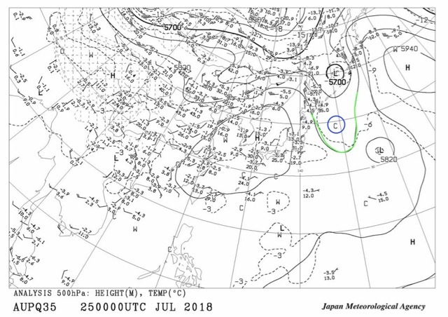 乱暴な言い方をすれば、寒気の一部分が切り離されて低気圧になった状態のことを言います。今回の寒冷低気圧について言えば7月25日09時の時点で太平洋高気圧が左右に分かれたときに寒気が入ってきましたが、その一部が切り離されて寒冷低気圧になったものと推定されます。この時の5oohPaの天気図が次の通りです。