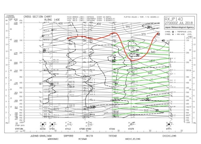 上の画像は前回の投稿時に使ったのと同じ高層断面図です。高層断面図は沢山の情報が書かれているため非常に見にくいです。なので少し色づけさせていただきました。緑色の線が気温(℃)です。赤い線は「対流圏界面」と言い、対流圏と成層圏の境目です(断面図に記載の圏界面高度を参考に私なりに線を引いています)。つまり赤い線から下は対流圏、赤い線より上は成層圏です。