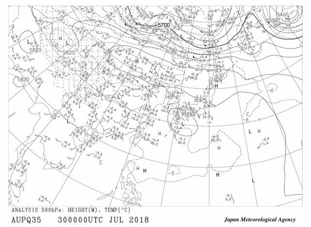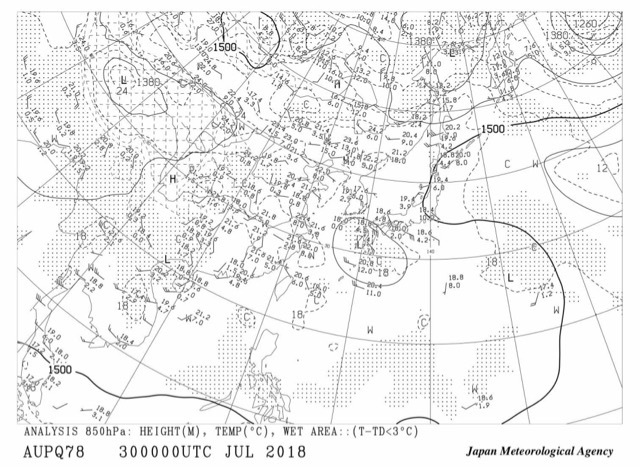 さて、7月30日現在の500hPa、700hPa、850hPaの各高層天気図を並べてみました。各天気図には矢羽で示されている風向きのそばに数字が二段に分けて書いてあります。上段が気温、下段が湿数(気温−露点温度)です。
