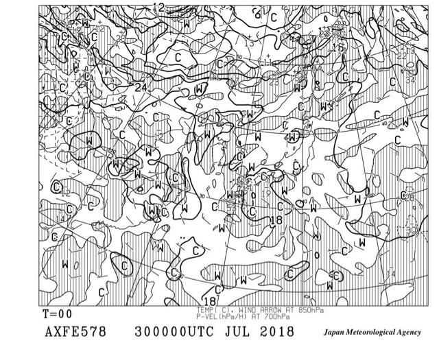 これは700hPaの鉛直流を追った実況図(30日09時)ですが、09時の時点では北海道と九州付近を除くほとんどの地点で下降気流になっていること、上昇気流なっている九州付近でも-19hPa/hと移流量が少ないことなどがK-indexの数値の低さに結びついたものと考えます。