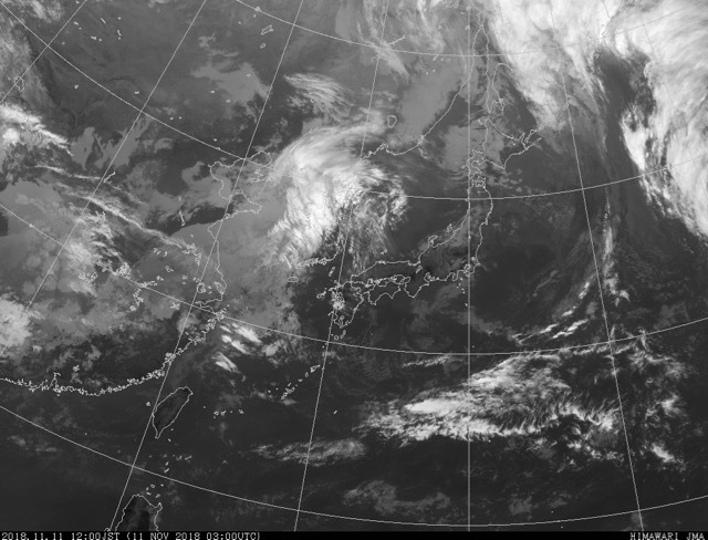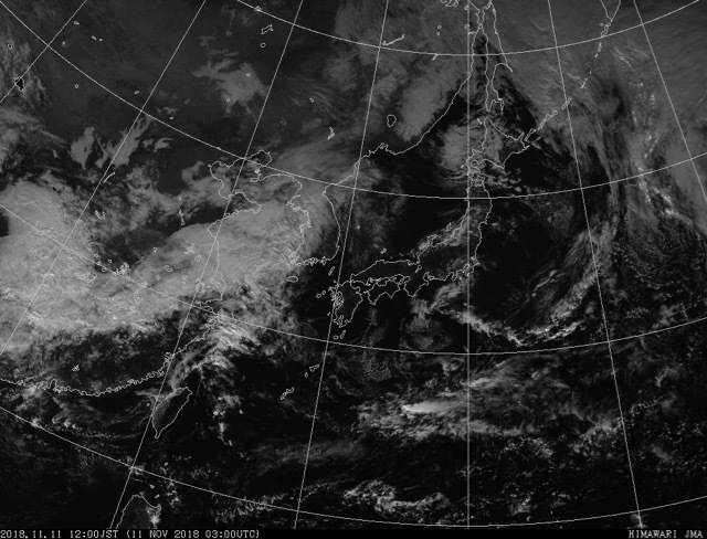 なんだか気象予報士の試験問題のようになってしまいましたが、両方の画像とも、朝鮮半島から中国華中かけて雲がかかっているのがわかります。ですが、赤外画像を見ると朝鮮半島付近が周囲と比べて白く輝いているのがわかります。赤外画像は雲の高度が高く温度が低いほど白く映りますから、朝鮮半島付近にかかっている雲は発達した積雲(積乱雲)である可能性が高いです。