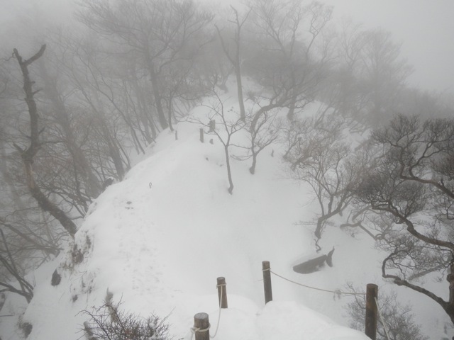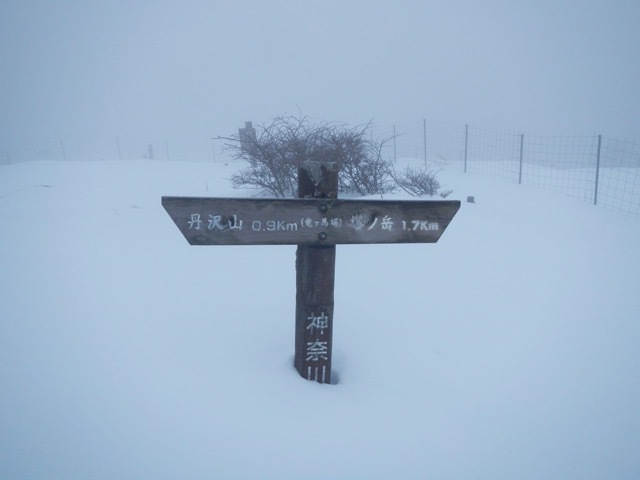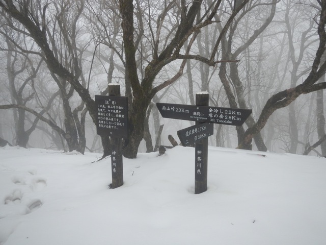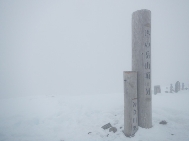 塔ノ岳山頂。ホワイトアウト寸前の状態です。