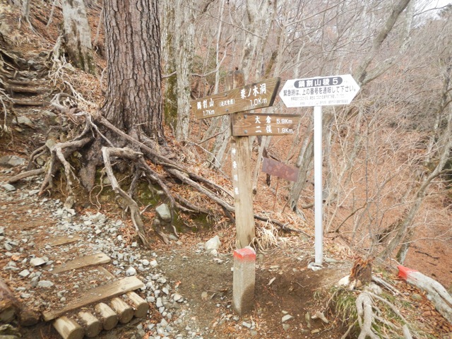 ここの分岐に着く頃には完全に雪はなくなっていました。二俣まで下りてしまえば後は平坦な道を歩くだけなので、もう少しの辛抱です。