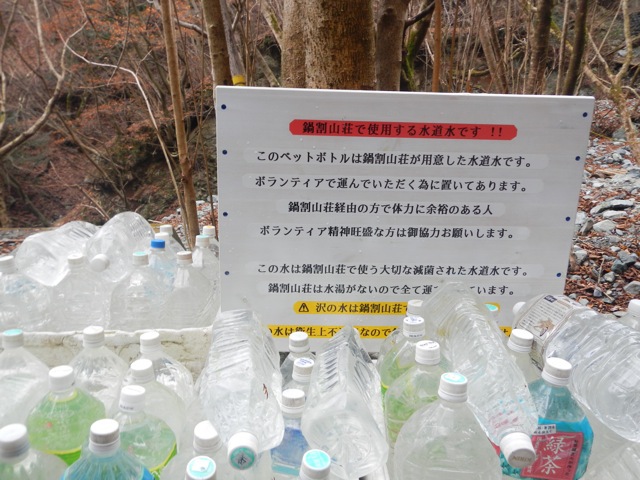 (写真の字読めますよね。一応・・・「このペットボトルは鍋割山荘が用意した水道水です。ボランティアで運んでいただくためにおいてあります。鍋割山荘経由の方で体力に余裕のある人、ボランティア精神旺盛な方はご協力お願いします・・・」と書いてあります)