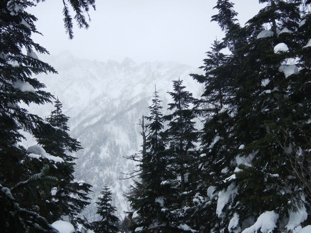 ほんの一瞬ですが、視界が開けました。大正池方面がかすかに見えました。本当はズームで撮りたかったのですが、この一瞬を逃したくなかったのと手袋だとカメラの操作がしづらいので、ズームなしでの撮影です。