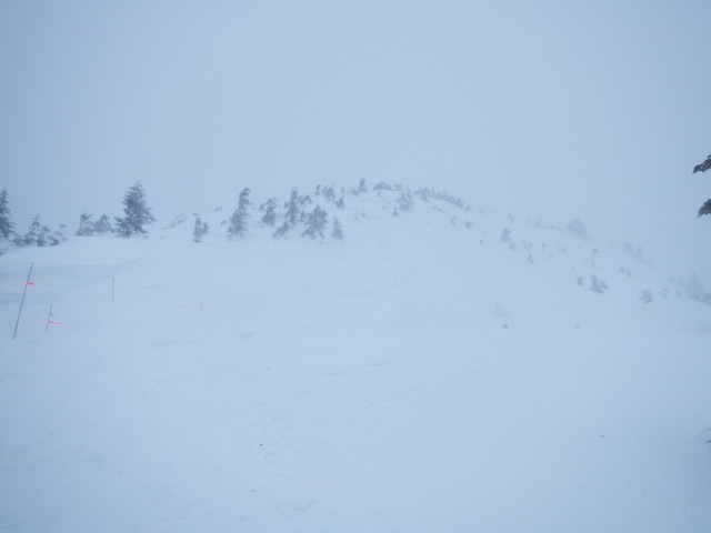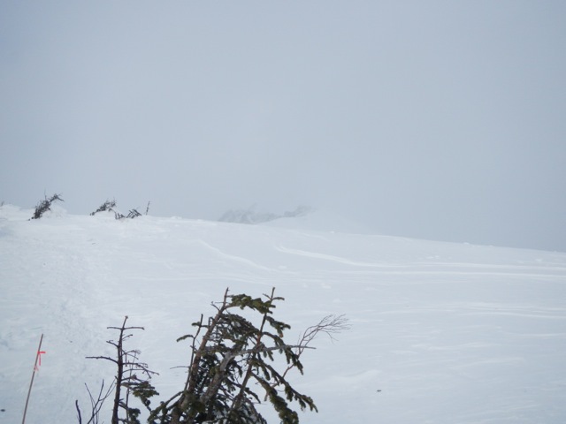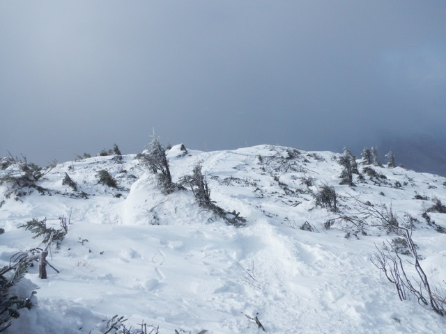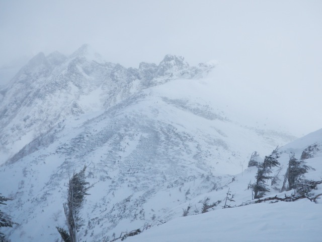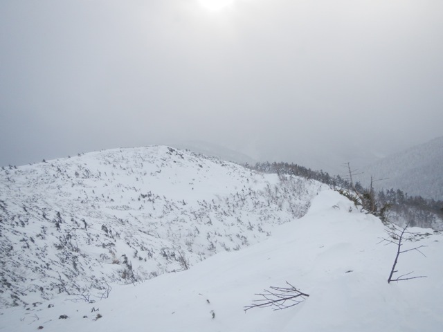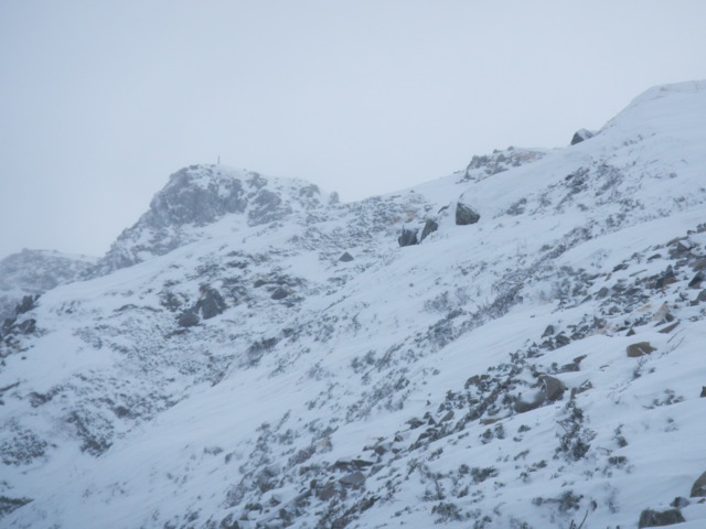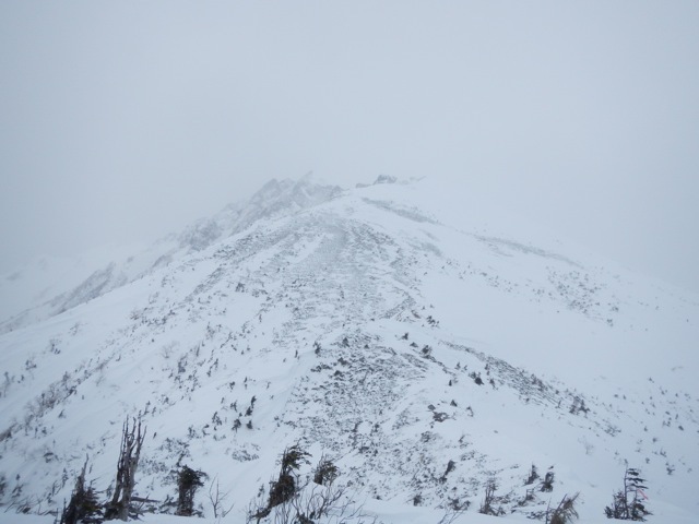 稜線上は昨日よりも更に強烈な暴風が吹き荒れていました。丸山山頂からは独標の姿が見えません。ひょっとして独標の頂上は雲の上か? などという甘〜い期待を背負いながら目的地に近づいて行きます。