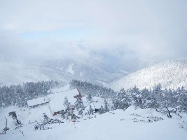 そして山荘が見えてきました。登山開始から約1時間30分。あれ、ガイドブック等では夏の時期で1時間30分て書いてあったような気が・・・ 冬ルートで雪の状態が良かったからなのかな?