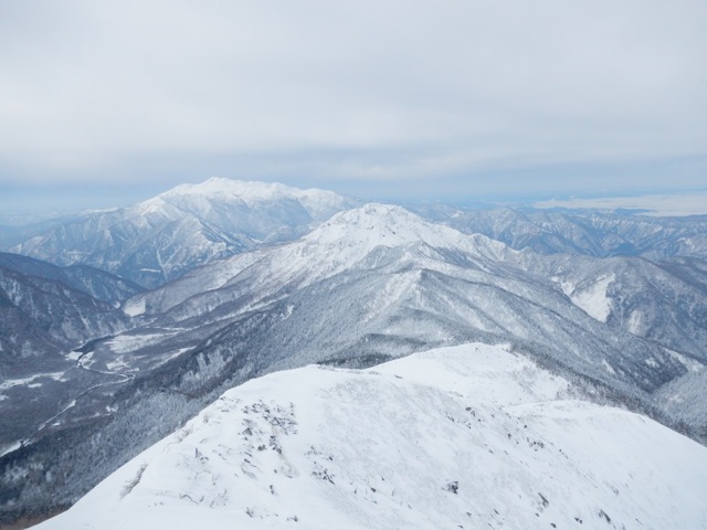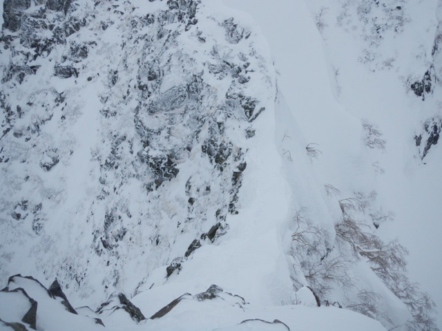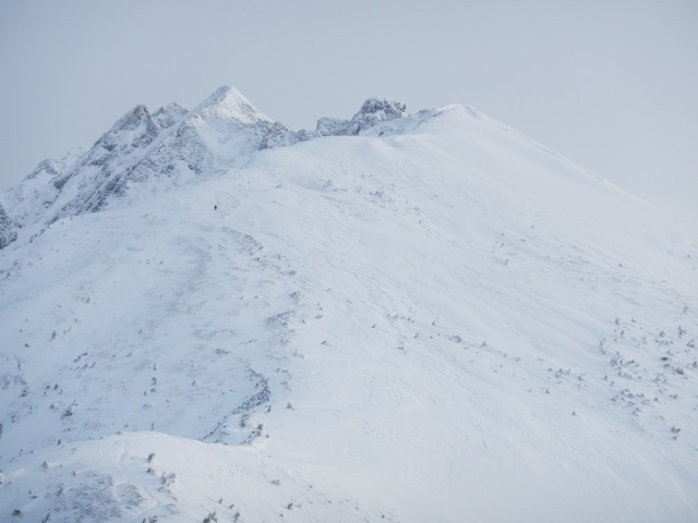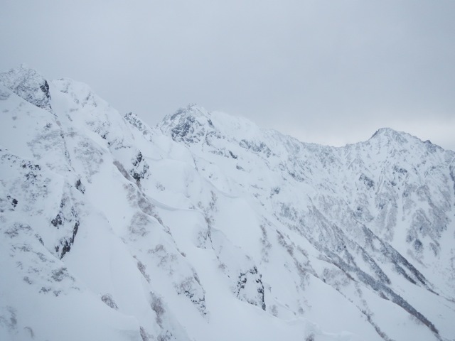 両側は絶壁です。雪庇を踏み抜いてしまったら即滑落です。どこが稜線なのか慎重に見極めながらゆっくり進みます。風がないのが唯一の救いです。