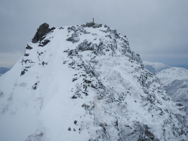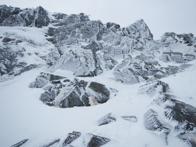 さて、ここから岩稜地帯の始まりです。ご覧のように岩は完全に凍っています。アイゼンの前刃やピッケルをフル活用して慎重に進んで行きます。