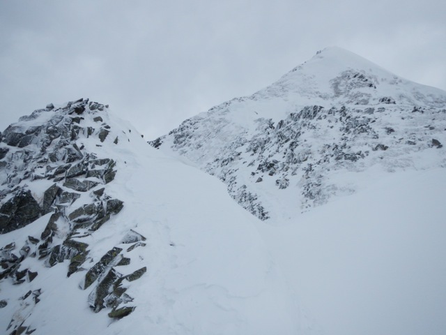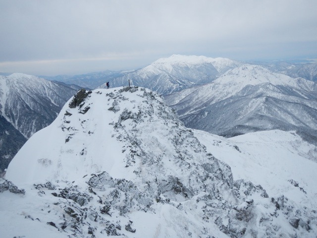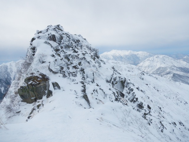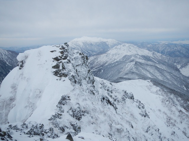 第9峰へは写真手前の岩場を下りて行きます。下りたところは写真を見てお分かりの通り雪庇が張り出しています。