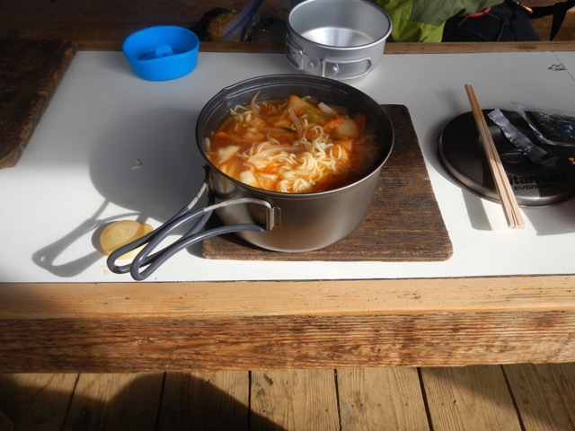 山頂で景色を眺めて停滞していると寒くなってきましたので尊仏山荘の中に入ってお昼ご飯を食べることにします。