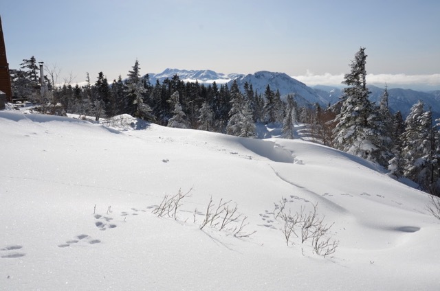 すぐ横を見ると雪面にウサギの足跡が残っています。姿は見えないけどここにも生き物が暮らしているんだなというのがわかります。遠くには焼岳や乗鞍岳も見えていて、とにかく最高の条件になっています。