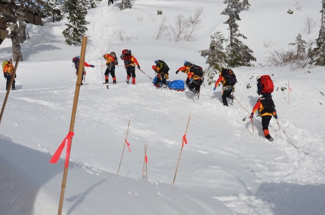 小屋での軽食・休憩を終えて外へ出て見ると、岐阜県警の山岳救助隊が搬送訓練をしていました。
