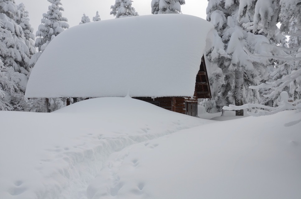 毎度のことですが、山荘裏手(夏季診療所脇)の部分は吹き溜まりになりラッセルになります。