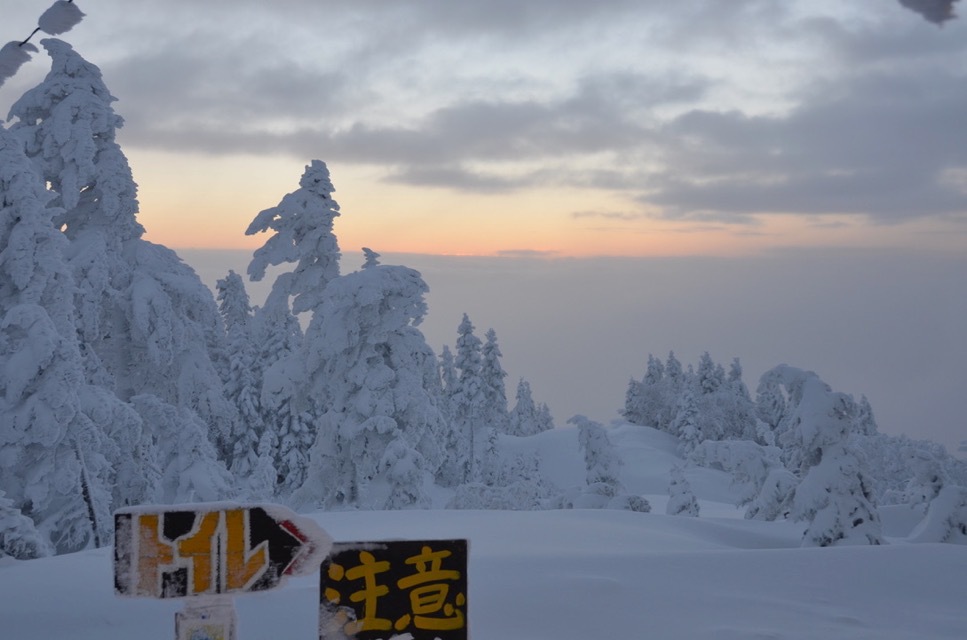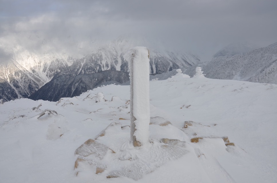 丸山登頂。道標は着雪しています。これも自然の姿なので、あえてそのままにしておきます。