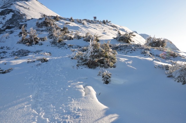 ピラミッドピークから頂上側へ降りる部分は完全に吹き溜まりになっていて、足を取られて横に雪崩れていかないように慎重に下りていきます。距離は短いしラッセルなんていう程のものでもないので問題なくクリアできます。