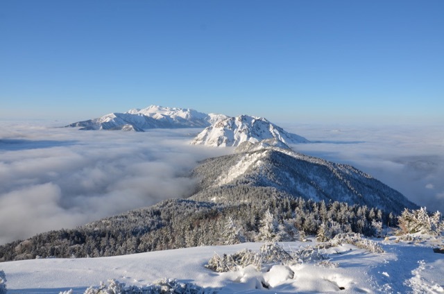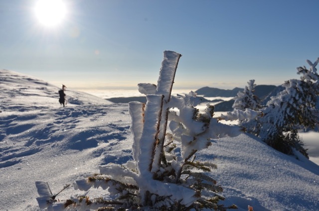 稜線の雪は昨日の樹林帯の雪とは変わって固まっています。昨晩から冷えたからと思われますが、アイゼンを履いているのでかえって歩きやすいです。