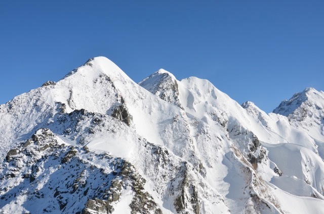 すでにこの時点でピッケルの入りが悪いなという感覚があったのですが、第3峰に向けてトラバースする時点で表層は准パウダー、下層はアイスバーンになってしまいました。もちろんトレースはありません。最初はピッケルが岩を直撃しているのかと思いましたが、どこを叩いでも同じような反応ですのでアイスバーンであることがわかりました。