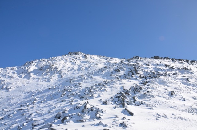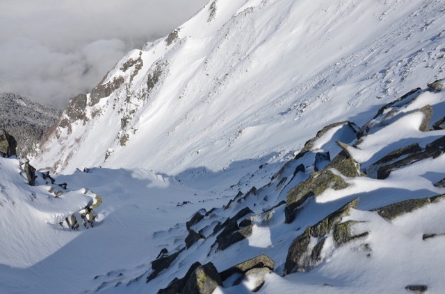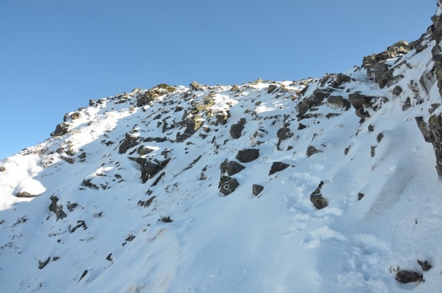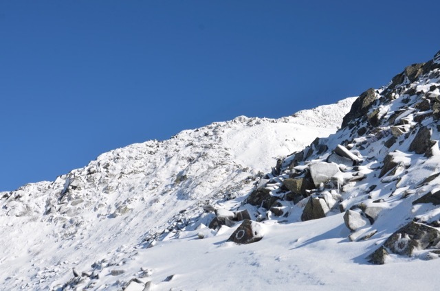 さすがは独標だけあって前日までのトレースがきちんと残っています。ただ、初見で直感したのは雪が少なく岩の露出が多いという事です。