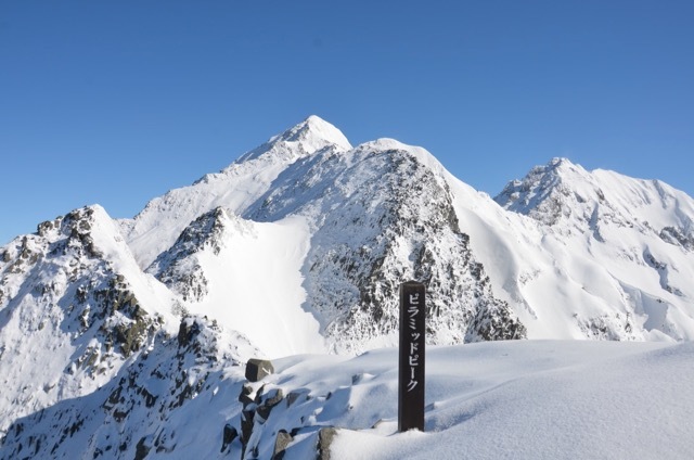 ピラミッドピーク手前の雪壁は以前に付けられたステップが下層に残っていて、蹴り込めば崩れることなく登っていけます。そして雪壁を超えた後は高度感のある最後の直下を新雪フミフミしながら詰めていきます。