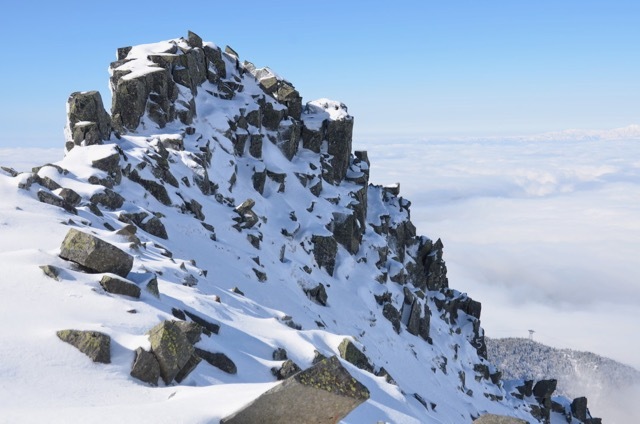 独標から先の岩峰帯で注意しなければいけないことの一つが雪庇です。雪庇ができるメカニズムを思い出ししつつ、この雪と稜線の形だとどの部分が実際の稜線で、どの部分が雪庇なのかをよく考え、慎重に足をおいて行きます。恐らく今日以降多くの登山者がトレースをなぞることと思いますので、きわどい場所にトレースをつけることだけは避けなければなりません。自分さえ登れれば良いというのはあまり好きではありません。