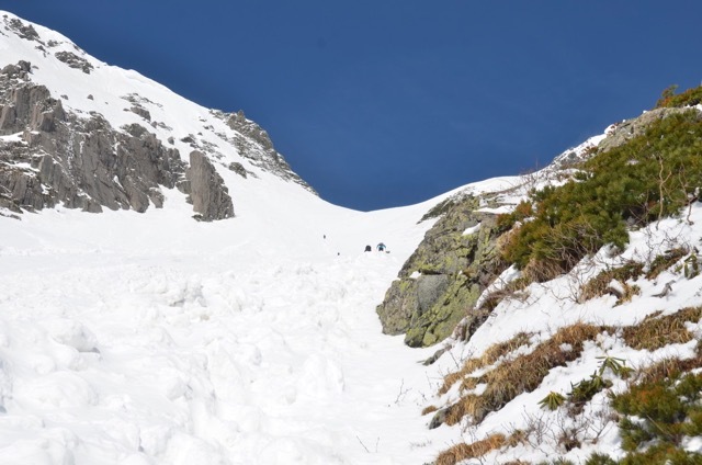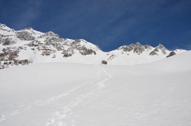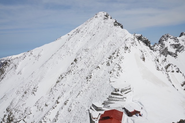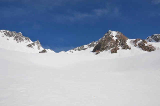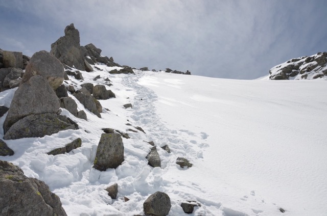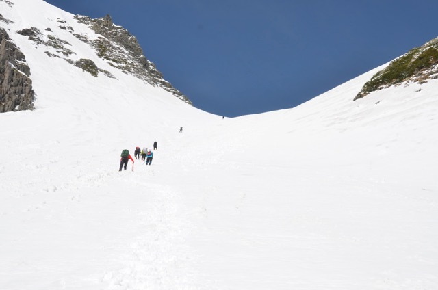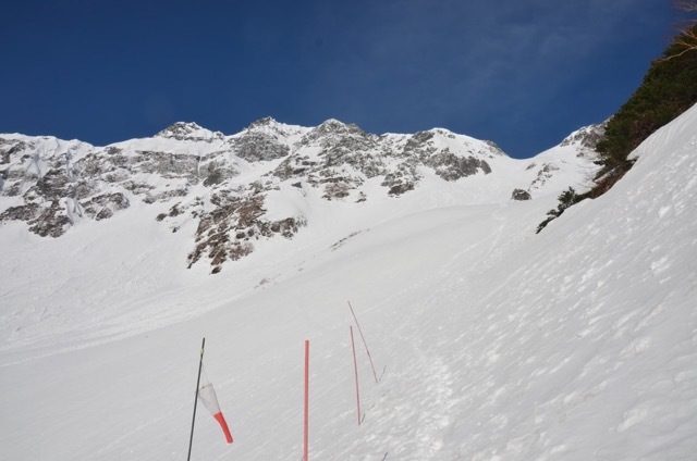 右手の岩場が無雪期の登山ルートとなるザイテングラートですが、この時期は雪崩による危険がある場合を除きあまり使うことはありません。逆に穴が空いていたりして困難なこともあります。