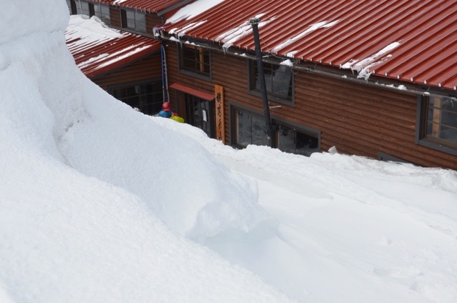 実は一番最初に穂高岳山荘に来たのがこの時期でしたので、個人的にはこの状況が穂高岳山荘のイメージとして定着しています。なので無雪期の山荘前の広いスペースが逆に違和感があったりします。