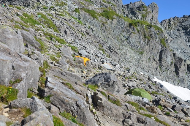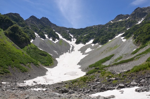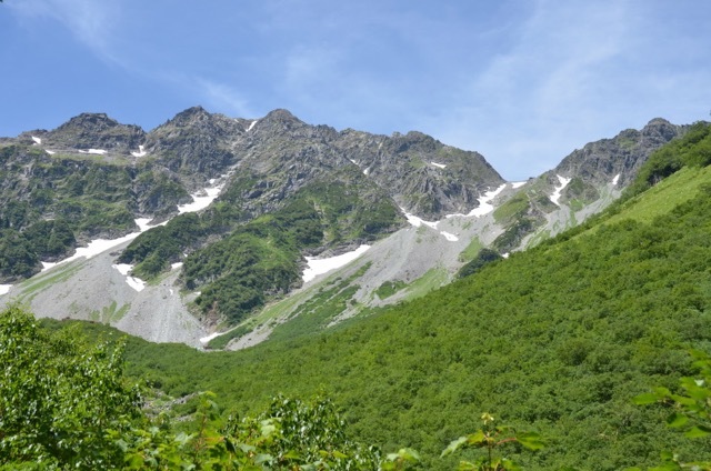 夏の穂高ですね。若干残雪が少ないような気もしますが、この猛暑ではこうなるだろうなと納得の状況です。今回の日程は例年より1週間遅らせたのでその間融雪が進んだのもあるかもしれません。