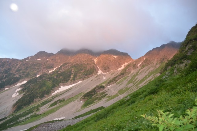 残念ながら涸沢から北穂高岳への登山道、特に下の方からは日の出が見えません。その代わりに燃えるような朝日が奥穂高岳を照らし、峰々は赤く染まっています。山頂付近は雲がかかっていますが、これは山特有のものですので本日の天候が曇りというわけではありません。事実雲は消え快晴となり午後は再び雲に覆われ、夕方は綺麗な夕日が見られました。