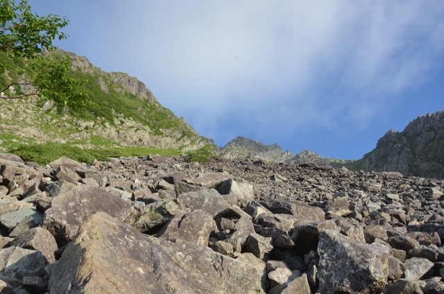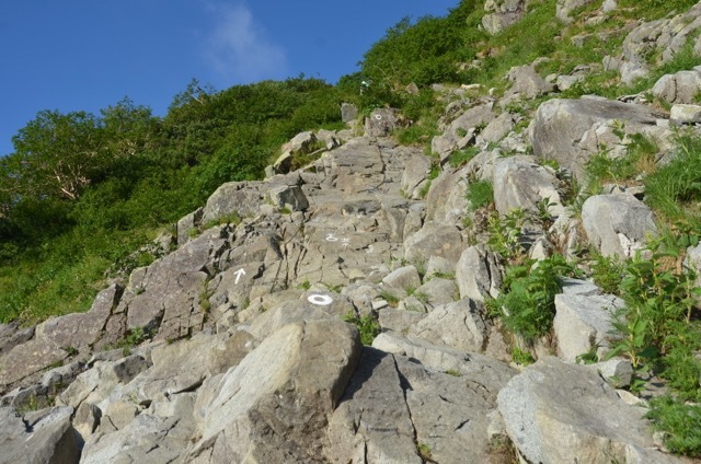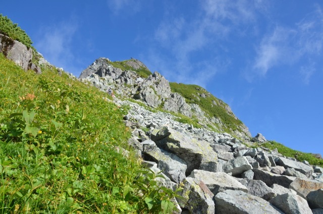 夏の高山植物が咲いています。高山植物らしく謙虚にでも美しく。でもその横で無味乾燥な岩場が登山者にこれでもかというほど容赦無く襲いかかります。もう、ここまで来たら後は連続する岩場を淡々とこなしていくしかありません。