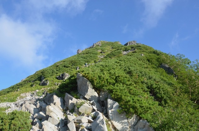 テント場から山頂までは約20分です。ここまで来たらあともう少しだと励みになります。山特有の天候で雲がかかってしまう場合は、いつもこの辺りまで来ると空が怪しくなって来るのですが今日は全くその気配がありません。