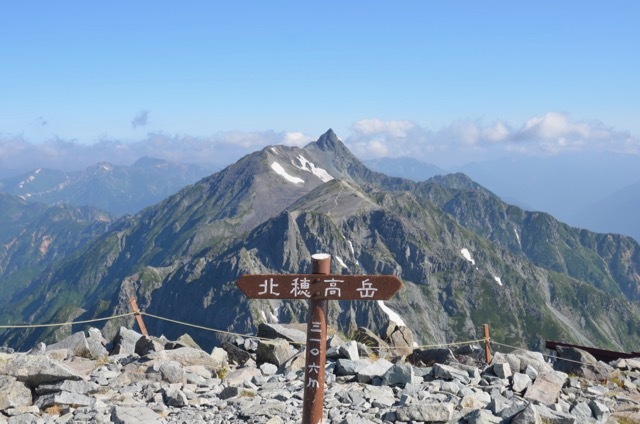 しばらく進んでいくとはるか先に北穂高岳が見えてきます。よく見ると山頂付近には北穂高小屋が見えて見ます。北穂高岳に登頂するのは明日ですが果たして今日のような快晴になるでしょうか。