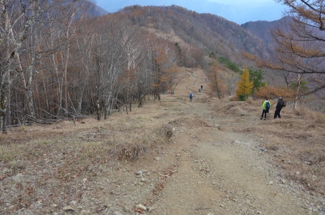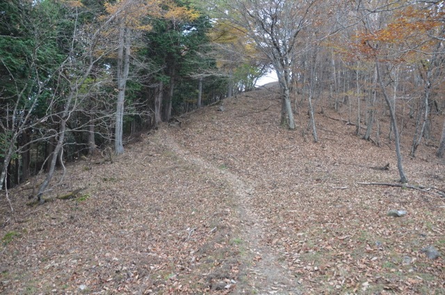 途中で右に分岐して行きます。後で地図をみると真っ直ぐ進む道もあったようで、等高線をみると比較的なだらかで、最後は車道を歩いていくようですが、道としては不明瞭なような気がします。