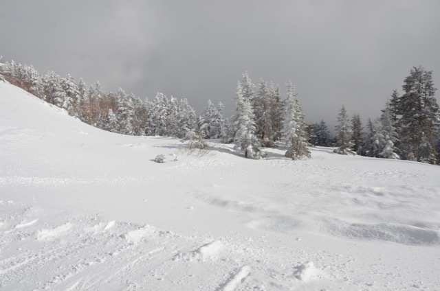 雪の量は樹林帯と比べるとそんなに増加したようには感じられません。増えているのは確実ですが風で飛ばされてるのでその増加量は少ないのかもしれませんね。風速は測定器を持っていないので正確なものはわかりませんがおそらく10m/s程度でしょうか。この時期にしては弱いくらいです。ただ身を切るような冷たさはないのでまるで春のような陽気です。