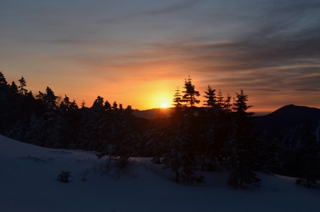 この時期は山荘前からご来光を見ることができます。日の出は徐々に左側になっていき、3月にもなると明神岳の向こう側になってしまうのでご来光はこの時期がチャンスですね。