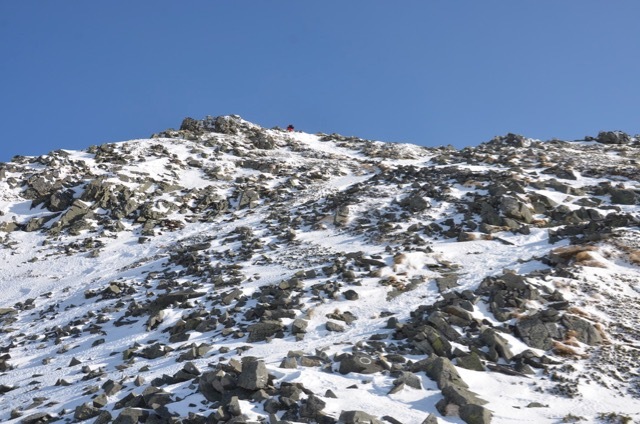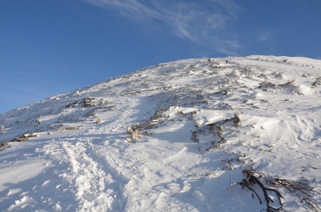 丸山から上部の延々と続く斜面は、よく見ると何となく夏道がナゾれるかなという程度。積雪量が増してほぼフラットになっています。風で大方の新雪は飛んで行ったと思われますが、それでも雪面はまだ安定していない箇所も多く気をつけないとアイゼンを履いていてもズルッと滑ってしまいます。