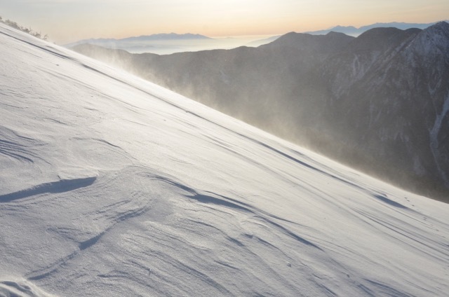 もちろん風が強いということは登山者にとってはあまりメリットのないことですが、この風が雪面を削り作り出した美しい芸術を見ていると「悪くもないかな」なんて思えてきます。