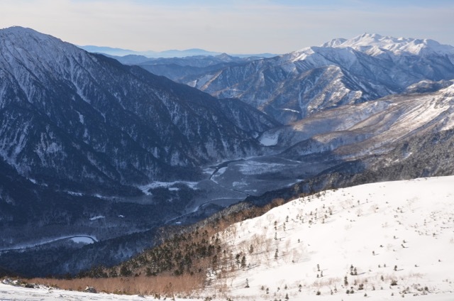 後ろにそびえる笠ヶ岳の稜線は雪が多くなりとても見ごたえがあります。同時にとても雪崩が起きそうな状態になっているとも言えるでしょう。