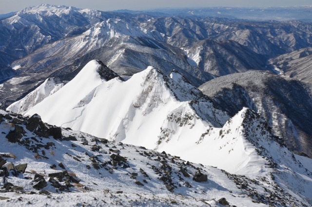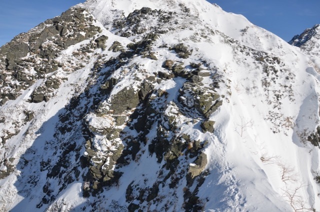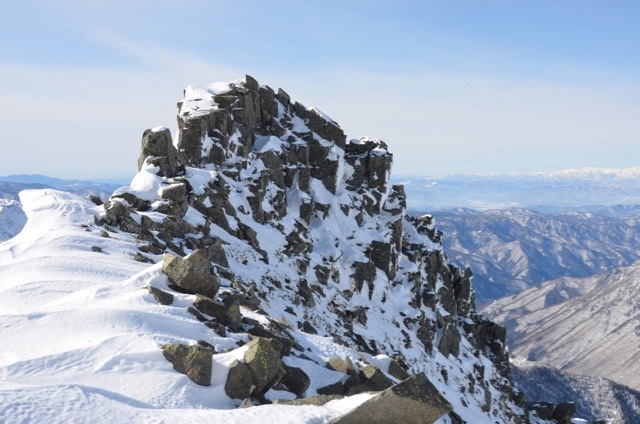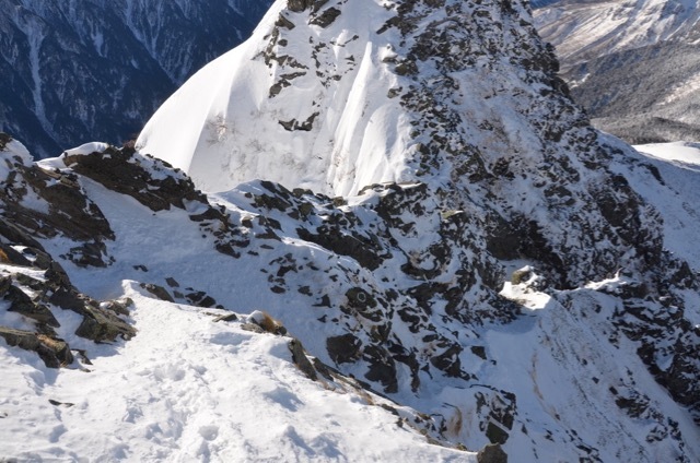 第10峰と第9峰のコルの部分は雪庇が張り出していますから飛騨側を歩くようにしなければなりません。その後の岩を飛騨側に巻いていく部分では足元が悪く、ホールディングできる岩も限られているのでかなり緊張する部分です。
