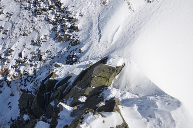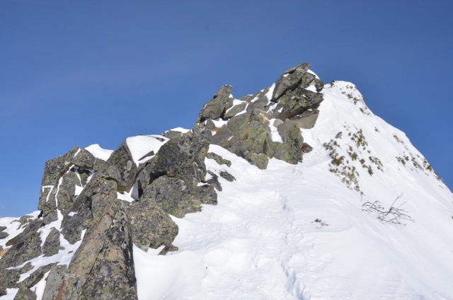 第9峰を超えてピラミッドピーク側に降りていく途中にあるこの岩場は、もっと雪が多いと信州側を巻いていけるのですが、今日の時点では危険と判断。おそらく雪崩れて谷底へ行ってしまうので、飛騨側を超えていきます。