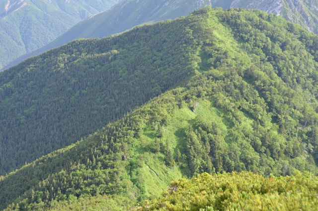 さて、蝶槍から先は目下にそびえる樹林帯まで一気に下って行きます。