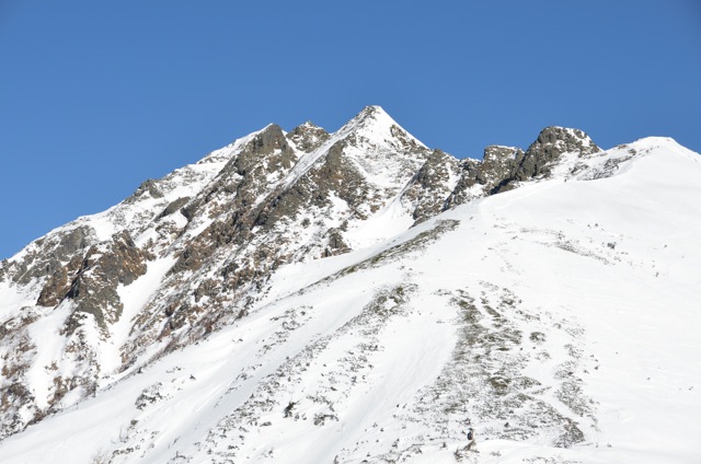 第9峰からピラミッドピークの稜線はトレースを忠実にたどっていけば大きな問題はないです。途中、雪の状態が悪いと進むのに苦労する場所はありますが、今日は雪の状態が良いので問題なしです。
