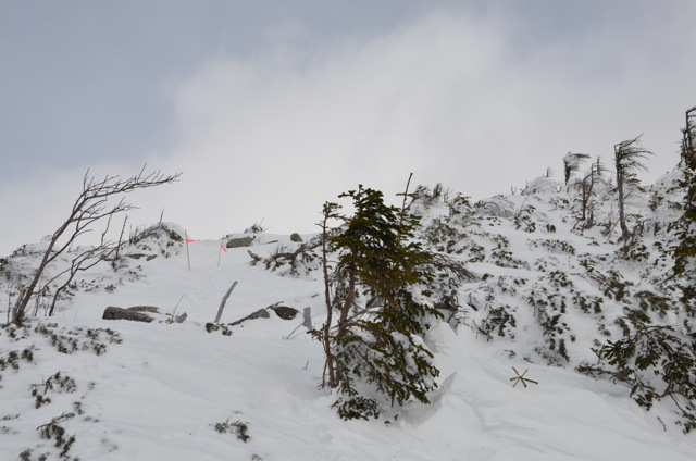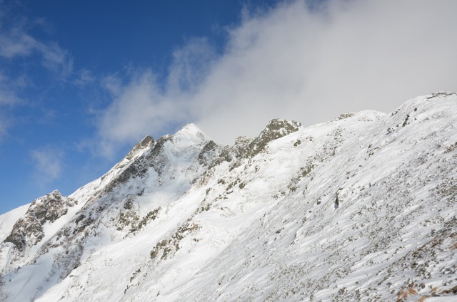 写真を撮った地点は出発してからわりとすぐの所(冬期ルート)なのですが、ここから稜線の気象条件が判断できます。で、今日は独標までは行けるかな?? という感じで何だか判断に迷う状況。多分稜線は凄く風が強いんだろうななんて想像します。
