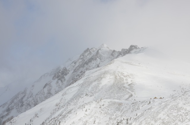 一瞬で真っ白になったかと思えば、雲が開けて峰々が顔を出す事もあります。正直なところ、もう少し好天だろうと予想していたので若干の期待はずれでした。この時点では翌日の天候のことはまだ分からなかったので、明日もこんな状態だったら、今回は独標止まりだなと勝手に結論したのでした。