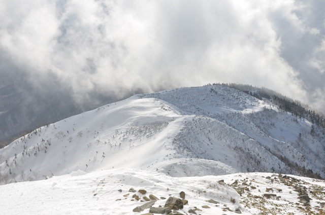 もうしばらく先へ登ると、稜線の雲が切れてこの先の峰々が姿を現しました。一瞬。そう、一瞬だけでそのあとすぐに雲の中になってしまいました。